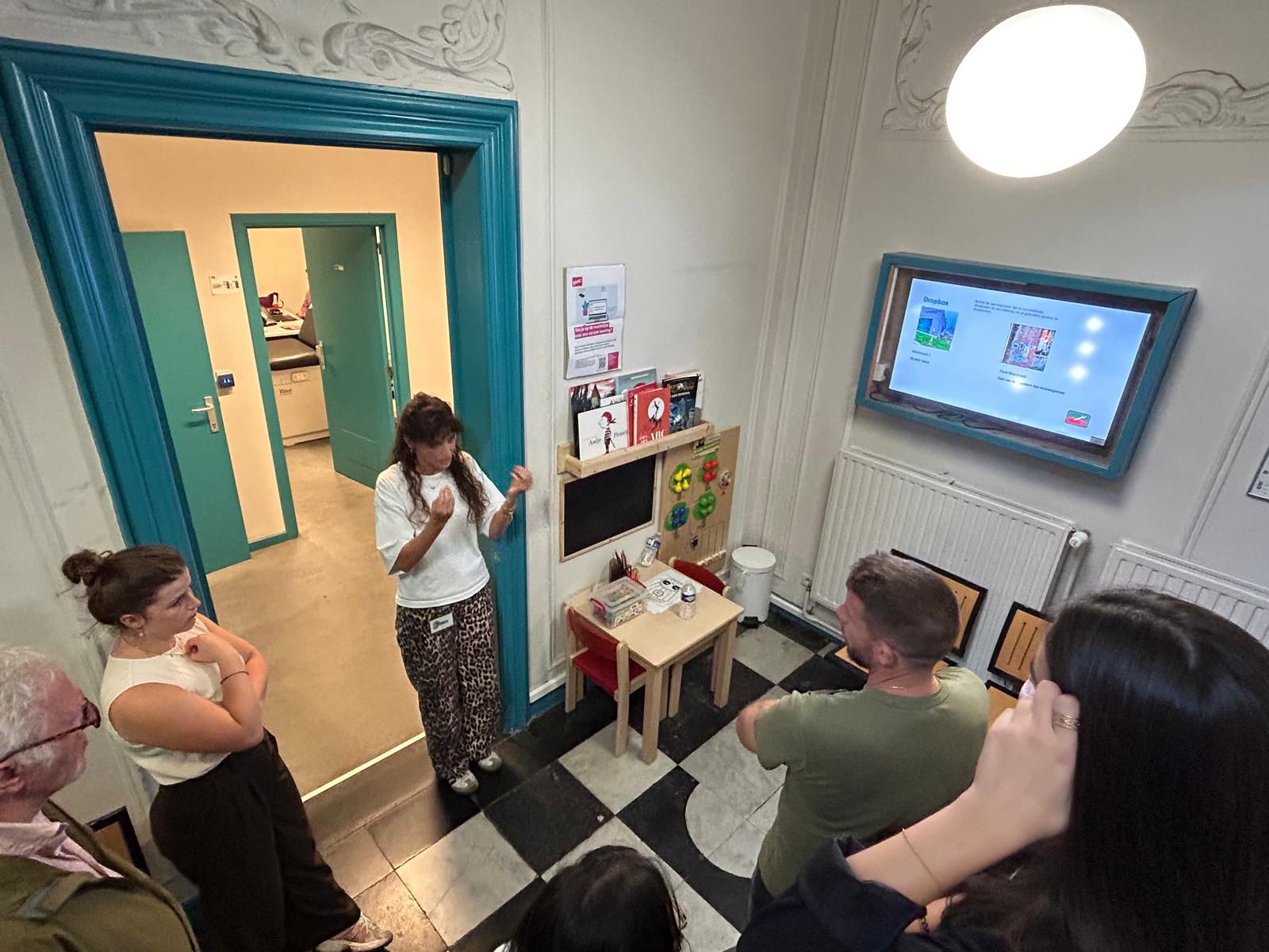 También los compañeros visitaron un albergue “Tránsito”, el cual se encuentra bajo tutoría policial, y que fue inaugurado en 1995 como un centro de alojamiento para adultos dependientes de sustancias (como estupefacientes, alcohol y fármacos). Este programa incluye nueve proyectos entre los que se encuentran el centro de crisis (día y alojamiento), el recurso conocido como LAIRR (acceso a equipos esterilizados), trabajos penitenciarios, la fase IV (talleres supervisados), trabajo en varios barrios de la ciudad, la fase V (acceso a viviendas sociales), el papel del Operador Regional de Bruselas (ORBA), diversas formaciones y el Espacio Mujer.